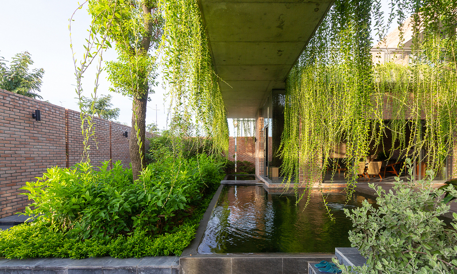 Từ ngoài vào trong, xuyên qua bức tường gạch đỏ là một lớp cây xanh, gồm nhiều loại cây khác nhau, cây bóng mát, cây bụi hay cây đổ. Chúng trở thành lớp vỏ cây xanh bao phủ ngôi nhà và giúp ngăn khói bụi, tiếng ồn đường phố.