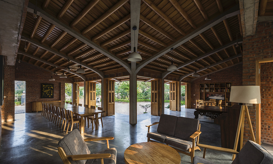 Toàn bộ nội thất gia đình và hệ thống cửa đều sử dụng gỗ xoan đào. Phần mái kết hợp cột và dầm bê tông tạo thành một không gian cao và rộng mà không cần đến những cây cao, dài và khó tìm. Cách làm này giúp giảm chi phí và đảm bảo tính bền vững của dự án.