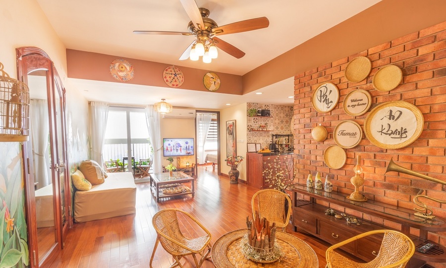 “Tôi thích bất cứ thứ gì mang đặc trưng văn hóa Việt Nam và thông tin về lối sống xanh. Tôi thể hiện tình yêu của mình ở đây.” Cô nói. Đã công bố. — Làm việc trong ngành du lịch, cô ấy có cơ hội đi nhiều nơi và tiếp xúc với nhiều nền văn hóa khác nhau, nhưng cô ấy luôn thích ở những vùng nông thôn có đồng bào dân tộc thiểu số sinh sống. Để bảo tồn và phát huy những nét văn hóa đặc sắc này, chị đã thiết kế các căn hộ ở bốn gian theo phong cách riêng của mình mà người dân ở mọi góc cạnh đều tôn vinh người Việt.